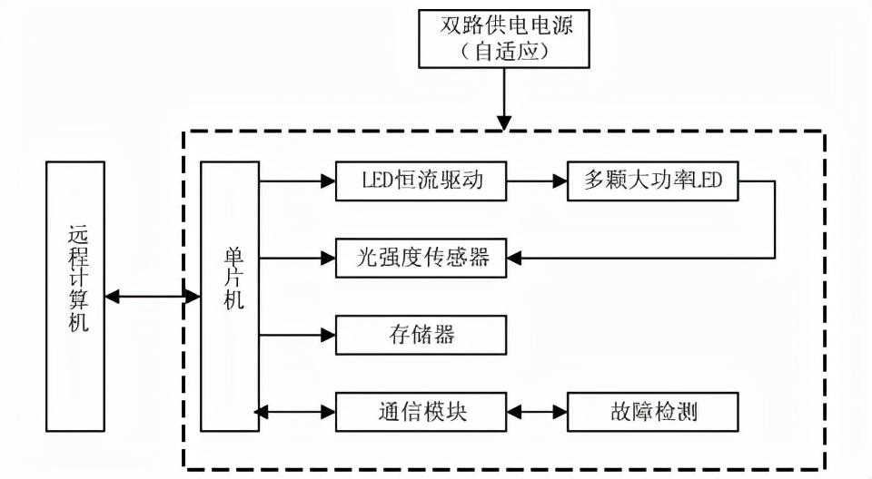 故障自动检测电路。系统能够对恒流源基准电压、路灯回路电流以及路灯状态进行反馈采集,并进行综合判断,得出系统工作状态。当系统控制输出值与恒流源基准电压值偏离时,回路未工作在恒流状态恒流源电路故障;当系统控制灯亮,而反馈路灯状态为灭时,路灯回路故障,此时,若恒流源基准电压为0,说明路灯开路;若恒流源基准电压正常,则说明路灯短路。系统实时查询上述各状态,形成故障自动检测体系。