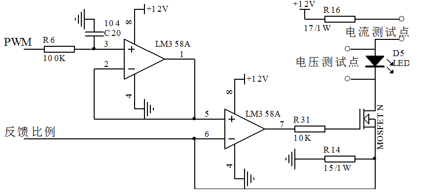 图5是恒流源电路,采用LM358搭建而成。第一级运放构成跟随器,可以得到第一级同相端3脚的电压与第二级运放同相端5脚的电压相等,从而得到反相端6脚的电压与3脚的电压相等,该电压经电阻R14形成一个恒定电流。因此,调整3脚输入的电压,就可以改变恒流源的电流。电路简单,元件很少,灵敏度高,不需要对外围元件进行匹配调节,真正实现免调试功能。