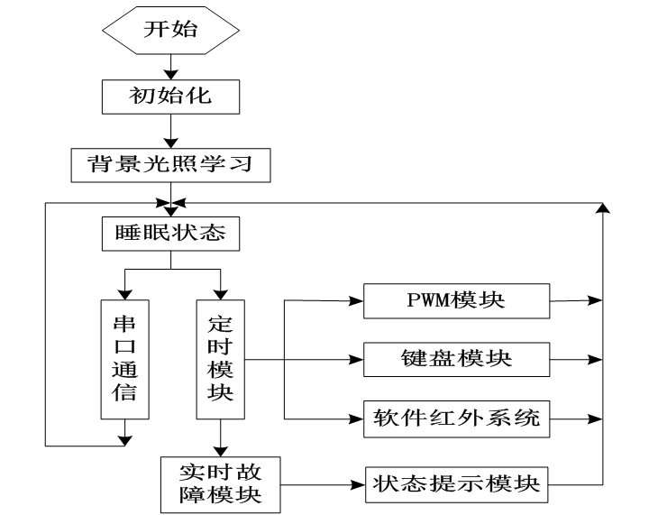 图7是单元控制器电路软件流程图。它包括串口通信和T0定时器模块两部分,其中T0定时器包括电子表、软件脉宽调制、键盘、软件红外系统、实时故障诊断以及动态显示六个子模块,系统不工作的间隙都是处于睡眠状态,有利于进一步减小系统功耗。