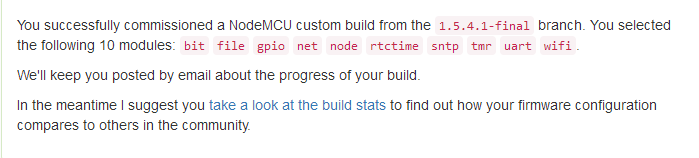 好在像作者这样的菜鸟可以在线订制固件,打开http://nodemcu-build.com/,留下自己的Email,根据自己的需要选择相应的模块和版本。等会就收到订制好的固件了。