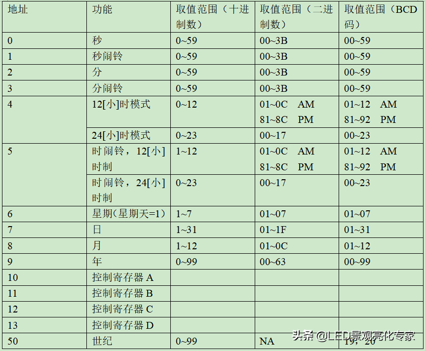 DS12887有128个RAM单元。其中4个单元用作控制寄存器,10个单元用作存放时钟字节,114字节为通用RAM。其主要寄存器如下: