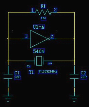 Y1是晶体,相当于三点式里面的电感,C1和C2就是电容,5404和R1实现一个NPN的三极管,大家可以对照高频书里的三点式电容振荡电路。接下来分析一下这个电路。