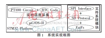 本文基于μC/OS操作系统平台,设计并实现了以PT100铂电阻为温度传感器、以STM32F107VCT6微处理器为核心的硬件平台,实现环境温度采集和实时时钟功能,并在PC上显示实时温度以及将温度数据按时间关系存储至TF卡文件中。系统实现框图如图1所示。