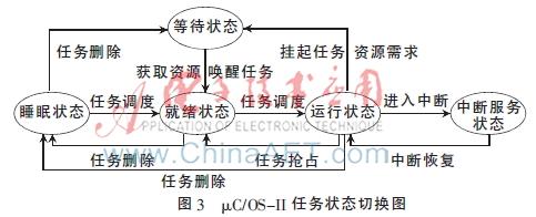 μC/OS-II是以任务为核心的实时操作系统,μC/OS-II V2.52可以管理64个任务,任务管理包括:创建任务、挂起任务、删除任务、唤醒任务、改变任务优先级和获取任务状态。每个任务都有唯一的优先级,优先级号越低,任务的优先级越高,任务越重要。在任一给定的时刻,任务的状态已知,且为以下5种状态中的一种,各任务状态切换如图3所示。