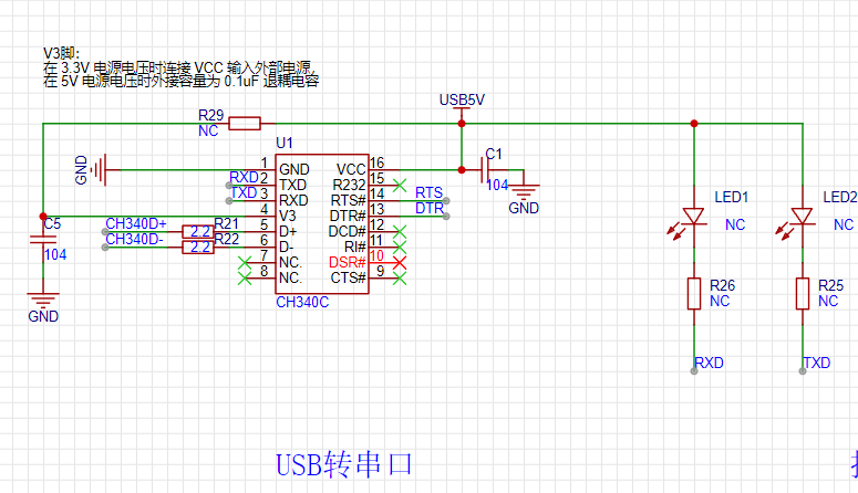 用于方便调试和升级烧录用(这个前期可以用,后期产品开发成型后可以做空焊),这里就用CH340C把看规格书搭好电路。