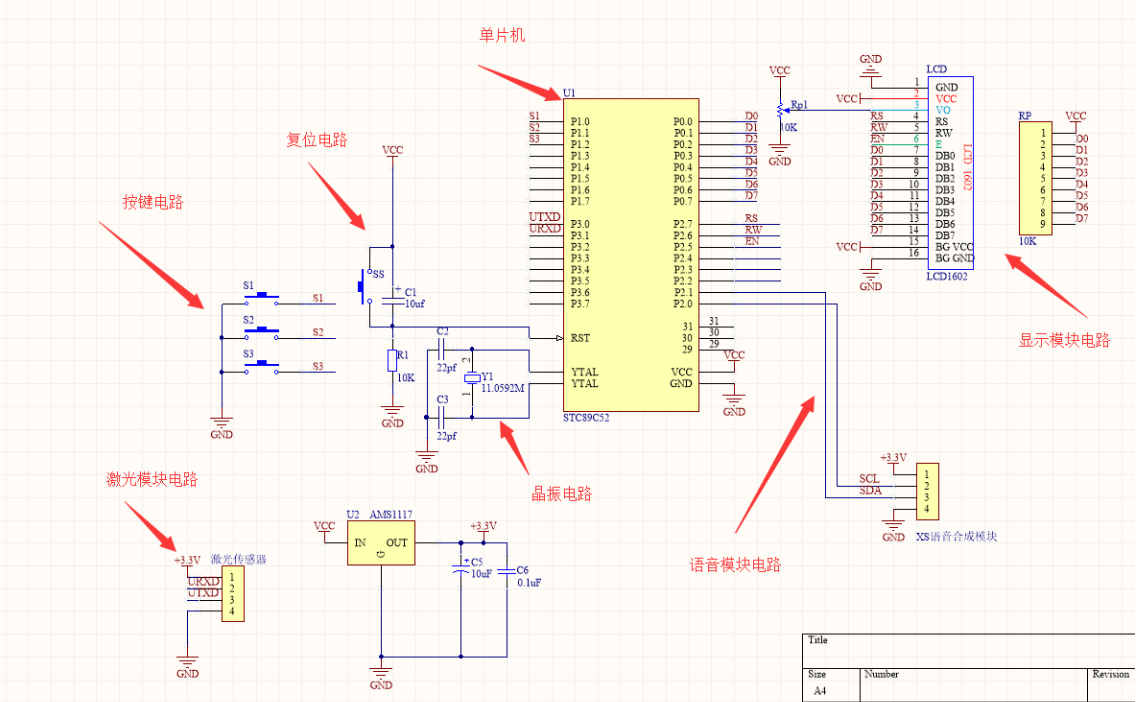 6.电源模块(AMS1117-3.3稳压器)。由于测量仪的位置不是固定的,测量时要随着使用者需要测量的地方而伴随移动,如果采用电源线连接外部电源十分不便于测量。考虑到其一体性和便携性,必须把电源集成在测量仪上,所以采用最简单的方式:干电池串联供电。5.5V-3.3V 是标准的STC89C52RC单片机正常工作电压范围,4.5V的电源可以用三节1.5V的干电池串联形成。此外,由于激光模块LDB6X743和语音芯片XFS5152CE工作电压为3.3V,因此还要使用稳压器对4.5V的电源进行处理,使其降压到3.3V。这里选用了AMS1117-3.3。AMS1117系列的稳压器常用于电池供电和便携产品中,它有两个版本可以选择:可调节版和任意固定电压版,精度为1%。本次使用的AMS1117-3.3从命名就可以看出来,它是3.3V的固定电压版,可以把4.5V的输入电压降压至3.3V,再对上述的两个模块供电。