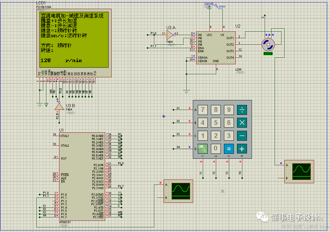 从仿真中具有电机驱动芯片可以看出来,这个仿真不但可以测速,还可以控制电机的转速。那剩下的部分就是人机交互接口了。显示部分使用的是PG160128A,液晶显示点阵是160X128的,可以显示更加丰富的内容。仿真中的输入设备为4X4矩阵键盘。剩下的就是虚拟示波器等测量工具。仿真电路很简单,接下来运行仿真看一下动态效果。