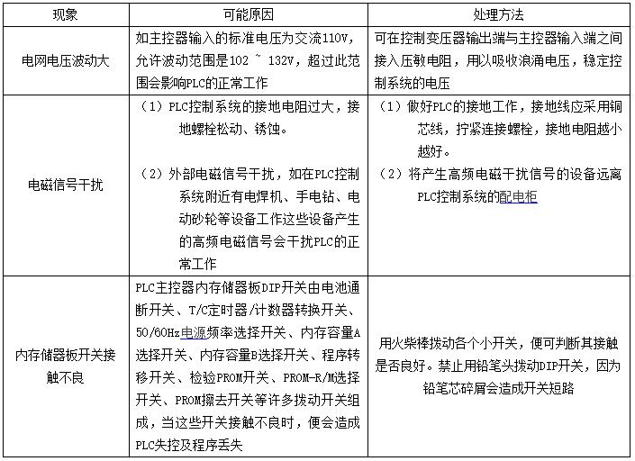 一、PLC接地不良 PLC主机及模块必须有良好的接地,通常采用主机外壳与开关柜外壳连接接地,当出现接地不良时,应考虑采用多股铜心线,采用从主机接地端子直接接地,确保良好接地。此外,还应保证I/O模块24V直流电源负极有良好的接地。二、接线有误 主机电源接线端子相线必须连接正确,不然也会出现主机不能启动,时常出错或程序丢失现象。为了防止程序丢失,需准备好程序包。一个完好的程序需提前打入程序包,以备急需。三、操作有误 使用编程器查找故障时。将锁定开关置于垂直位置,然后拔出,就可起到保护内存的作用。如果要断开PLC系统电源,则应先断开主机电源,然后再断开I/O模块电源,如果先断开I/0部分电源,或.I/O部分和主机电源同时断开,则会使断电处理间存入不正确数值而造成程序混乱。四、PLC受到干扰 由于干扰原因造成PLC程序丢失,其处理方法可参照PLC受干扰引起的故障的处理,尽可能地抑制和削弱干扰。可借鉴的解决方法: