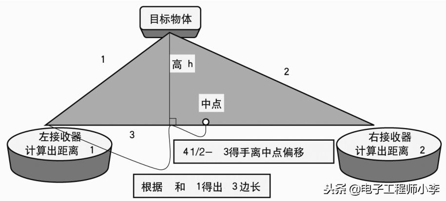 最重要的要算是算法设计与选择了。我一开始使用的是三角形原理,算法复杂,计算量很大。我当时是这样想的:在图2.23中把两接收器间的距离看成三角形的底边,把目标物体看成是顶角,左/右侧接收器测出三角形的左/右边。因为3边长度都知道了,根据海伦公式便可知其面积s: