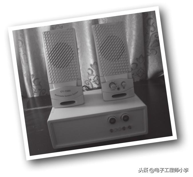 同样,为了简化硬件,放大器仍用现成的模块,如图2.4所示。现在的音频放大器模块种类很多,具体规格就要看你自己的喜好了。我选用的是一款功放芯片为TEA2025B的3W双声道模块,其增益可通过微调电阻调节,+5~+12V供电,用来做电脑的桌面音箱已经足够了。