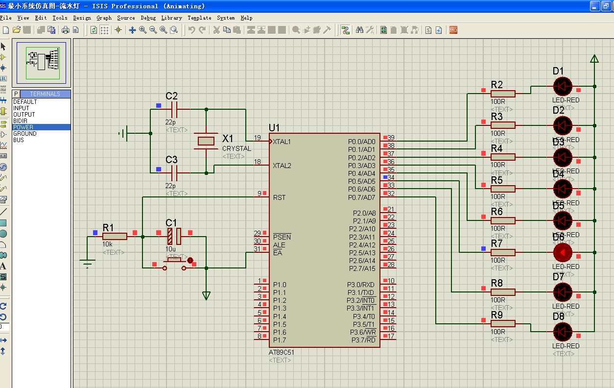 在做板子之前,先用Proteus仿真软件做了仿真。Proteus仿真支持51单片机并可以实现运行程序的功能,当把程序写好后加载至Proteus即可实现程序的调试,Proteus还可以与Keil软件实现联调功能。所设计的仿真电路如下图所示。