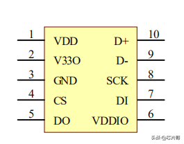 Pin1引脚VDD:芯片的工作电源引脚,工程师在项目应用中,直接连接到USB的VBUS电源引脚;Pin2引脚V33O:芯片的3.3V电源输出引脚,可以作为其他电路模块的工作电源电压;Pin3引脚GND:芯片的参考地线;Pin4引脚CS:芯片的SPI通信片选信号引脚,工程师在项目应用中,直接连接到SPI通信接口的CS引脚;Pin5引脚DO:芯片的SPI通信数据输出信号引脚,工程师在项目应用中,直接连接到SPI通信接口的DO引脚;Pin6引脚VDDIO:芯片的SPI通信功能电源引脚;Pin7引脚DI:芯片的SPI通信数据输入信号引脚,工程师在项目应用中,直接连接到SPI通信接口的DI引脚;Pin8引脚SCK:芯片的SPI通信时钟信号引脚,工程师在项目应用中,直接连接到SPI通信接口的CLK引脚;Pin9~Pin10引脚D-&D+:芯片的USB通信信号引脚;HT42B533芯片工作原理