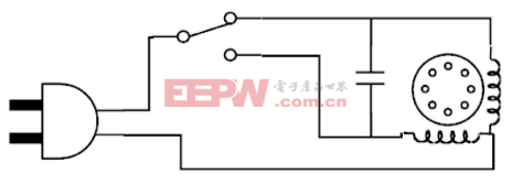 图1 传统交流感应电机的拓扑结构;电容提供所需相位差以产生旋转磁场