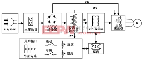 逆变器配电盘可以被构建成一个特定于应用的平台而 非一个通用演示板。然而,它提供了很多输入和输出(I/ O)接口以便用户操作和修改。逆变器被设计成可以驱动 单相或三相交流感应电机。配电盘概观如图4所示,使用了Microchip的PIC16F1509单片机。该配电盘在设计时考虑到了灵活性,