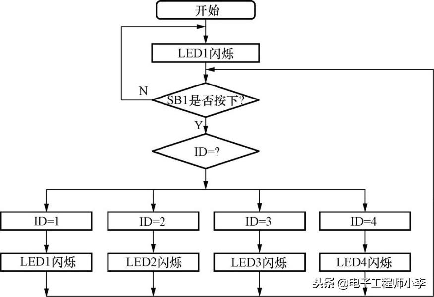 一键多灯控制要求:有4个灯L1~L4,启动单片机后,L1亮;按下按键SB1,L2亮;再按下按键SB1,L3亮;再按下按键SB1,L4亮;再按下按键SB1,L1又亮。如此循环往复。