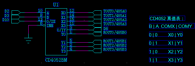 简单的单片机一般只有一个或者两个串口,可以通过CD4052把1路串口扩展成4路,原理图如下: