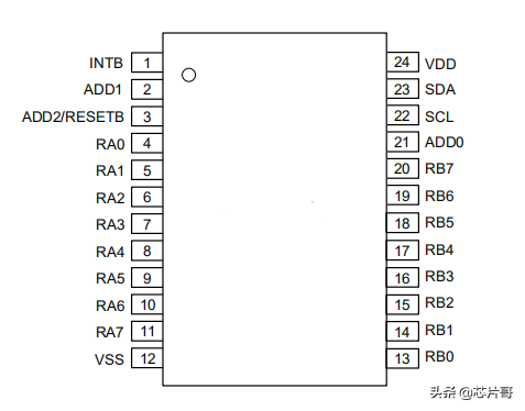 通过引脚功能定义,工程师基本可以分析出芯片的工作原理,也就是通过IIC接口扩展了单片机的IO引脚数量,这从芯片的内部结构框图更容易看出