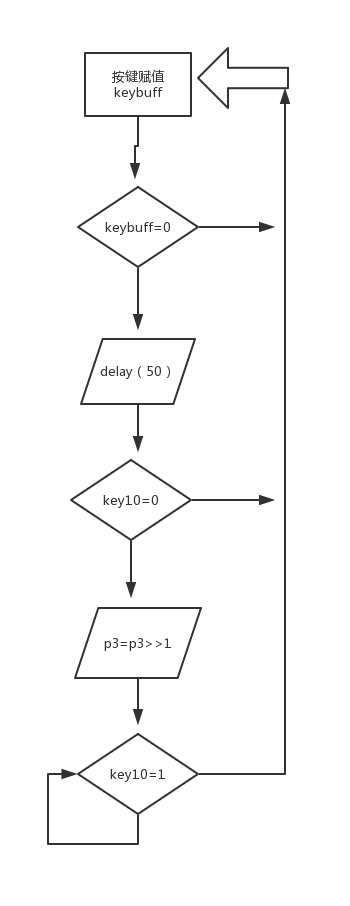从这一段可以看出,只要我能满足keybuff为零,key10为零,那么程序就会在延时结束再次进入程序,如此循环,就造成了,按键按下,P3被连续执行动作。我们怎么才能让这种情况不发生呢?这就需要我们不仅检测按键按下,还需要检测按键弹起,只有按键弹起我们才允许它执行下一步,这样就能按下一次,抬起手,才会停止,保证了操作的准确。