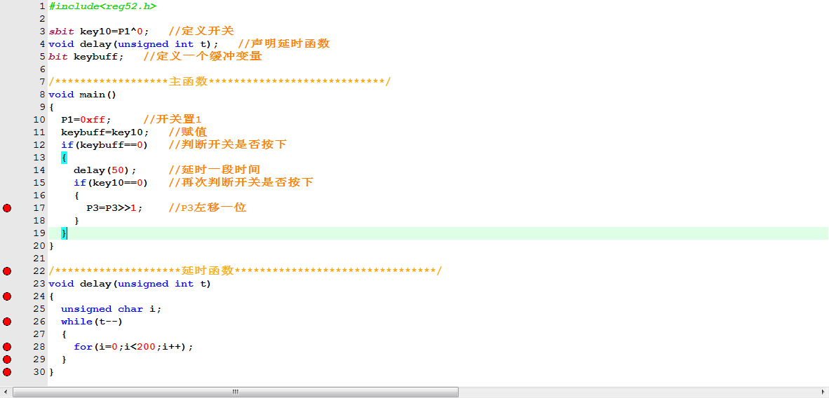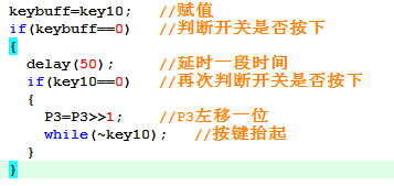 主函数中,先把开关采集端口置1,这是读取数据的前提条件,然后把需要采集的io的状态转移给中间变量,接着判断此时中间变量是否为零,也就是按键是否按下,如果没有按下,那就跳出,继续赋值,接着判断,直到判断为零,进入语句中,先延时一段时间,让抖动空过去,延时结束,再判断一次,由于此时程序还没走出去,所以中间变量的值也没有实时切换,我们此时要判断按键实时状态是否为零,就需要判断端口的实际值,当key10为零,就说明按键确实处于按下状态,这就可以执行,移位指令。