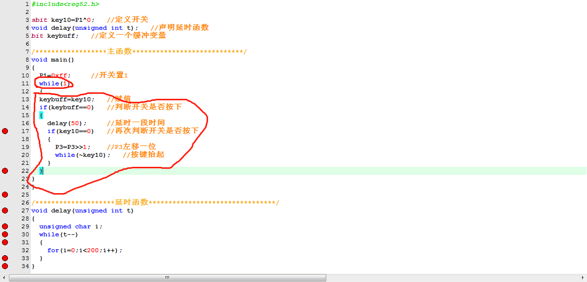 我们就是用延时来,把抖动的时间空过去了,这样就不用担心抖动产生的电位频繁变化了。接下来,我们看下程序如何写。