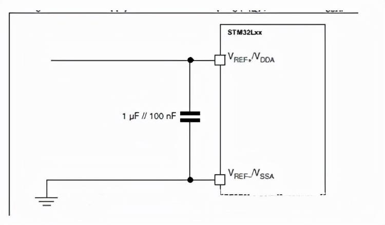 通过这种方式,使用者不必再去考虑参考电压的精确度和稳定度,使用STM32的电源电压作为Vref+就可以了,如图所示
