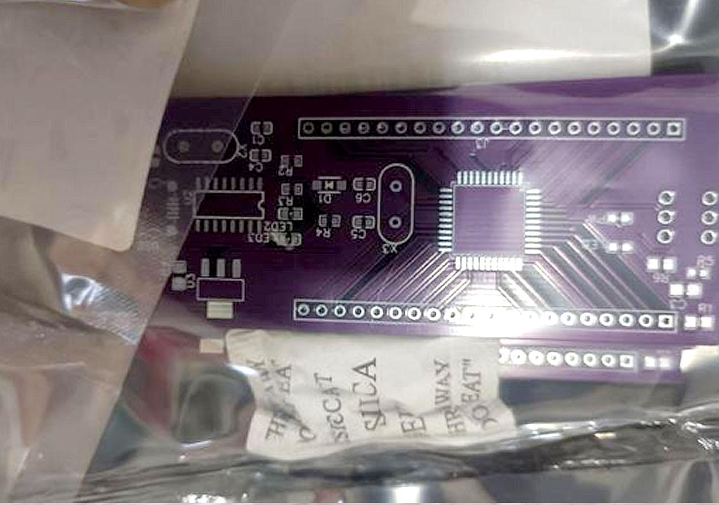 又过了一段时间,我得知,嘉立创竟然推出了免费打样,0元就能包邮到家,这真的是惊到我了,于是怀着学(bai)习(piao)的心情注册了账号,下载了立创EDA,随便画了一个最小系统电路,下单,提交,真的是0元!没过两天,我就收到了第一块PCB,激动的拆开纸盒子,里面是真空袋包裹的五张PCB,迫不及待的焊接上元件,电路运行正常!