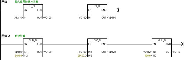 AIW16为从温度变送器接收来的数据,温度的最终数值为浮点数(也就是有小数点)类型,所以要先转换为实数,网络1第一列的指令为数据转换指令,将AIW16(整数)的数值转换为双整数,存储在VD100地址内;网络2第二列指令为将双整数转换为实数,结果保存在VD104地址内。所以网络1的程序功能是,将采集的数值(证书类型)转换为实数类型。网络2的程序就是按照上面的公式进行计算最终得出实际采集的温度数值为VD116地址内存放的数值。