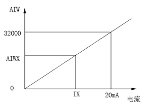 S7-200系列PLC模拟量模块可处理数值范围为0—32000,电流范围为0-20mA。也就是数值0对应着0mA,数值32000对应20mA。两者之间的关系可以用二维坐标系表示,如图2所示。