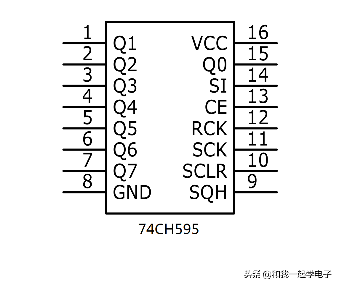 74HC595是一个8位串行输入,并行输出的位移缓存器,管脚图如下所示