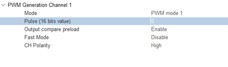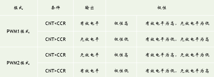 STM32CUBE中PWM的设定主要是以下参数,Mode(模式)和CH Polarity(极性)两个参数相互配合,确定PWM的具体输出波形,具体见图4。Pulse参数即为CCR寄存器的参数,设定占空比的。