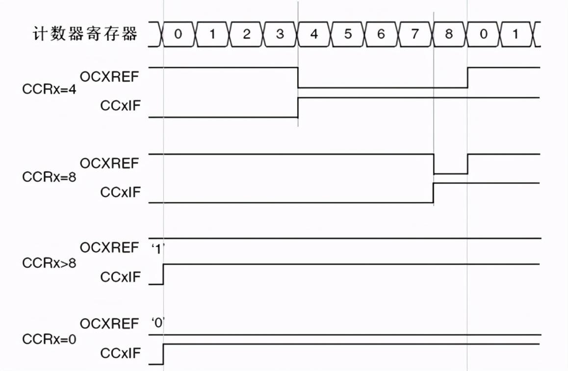 波形周期是通过定时器的时基参数中预分频系数(PSC预分频寄存器)和自动装载值(ARR寄存器)进行设定。对于此时基设定不清楚的朋友可以看下我之前的视频—定时器时基设定。首先预设比较寄存器CCR的值, 计数寄存器CNT的值与CCR的预设值相比较。根据预先设置,当CNT的值计数到与CCR预设值相等时,输出电平产生跳变。对于占空比的调节,我们可以通过改变CCR的值来调节。下图为ARR寄存器设置为8时,以定时器向上计数模式时电平翻转波形图。当CCR=4,CNT计数到4时输出电平翻转,CCR=8时,CNT计数到4时输出电平翻转。图2 电平翻转波形图