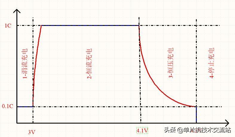 言归正传,锂电池的充电过程我们可以划分为四个阶段,1-涓流充电;2-恒流充电;3-恒压充电;4-停止充电。