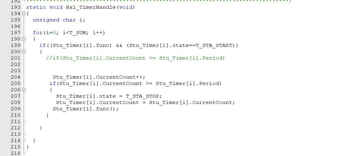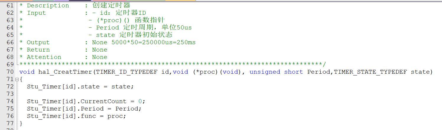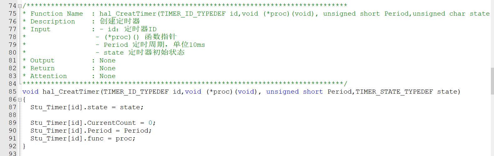 需要有个变量当做开关标志控制该定时器启动/停止 需要有个变量当做当前的定时值 需要有个变量当做该定时器的定时周期。 定时时间到了以后,需要去执行相应动作,为了灵活使用,需要一个函数指针。那用结构体来表示代码如下: