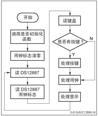 整个程序由几个模块构成,文件mmi.c中包括一些人机交互处理的函数,比如读取按键、在数码管上显示时间信息、LED和蜂鸣器的发声处理等;文件ds12887.c中包括读写和初始化DS12887的函数;文件my52.c中包含延时函数;在文件main.c中则调用这些模块中的函数进行综合处理,主函数的程序流程图如图5.4所示。各个xxx.h文件中则是相应的xxx.c文件中的函数声明、全局变量声明等。更多源程序可以到qq群657864614进行下载!