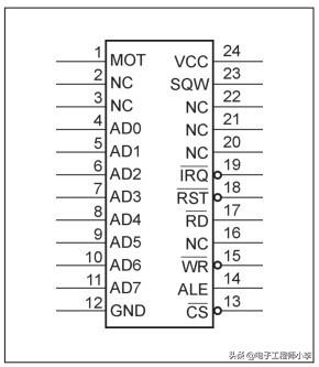 了解了“主角”的基本特性,再来看看它的引脚。一个芯片的引脚可以看作是跟外界“交流”的通道,了解了引脚的用法就可以知道如何跟单片机相连。芯片引脚如图5.2所示,其中部分引脚命名与官方的数据手册有所不同,原数据手册上使用的是Motorala总线时序的命名方式,这里为了方便理解,采用Intel总线时序的命名方式,因为文章所使用的51单片机即为Intel时序。这两种总线时序最初分别是用在Motorala和Intel两家公司生产的芯片中,有兴趣的朋友可以在DS12887的数据手册上找到更详细的信息。