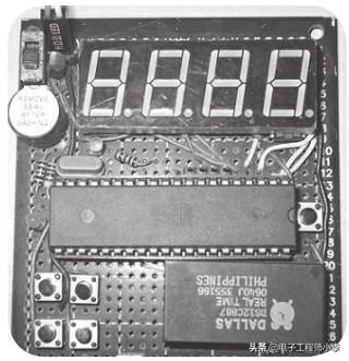 先了解一下“主角”的基本特性吧,DS12887是Dallas半导体公司推出的实时时钟芯片,在芯片内部集成了石英晶体、锂电池和其他支持电路,在没有外部供电的情况下,可以正确走时10年;可以计数时、分、秒、年、月、日和星期等信息,而且闰年补偿到2100年有效;内部的闹钟寄存器用来保存闹钟时间,当实时时间等于闹钟时间时,在DS12887的IRQ引脚输出低电平,微控制器可以利用此信号作为闹钟信号来处理。笔者用万用板焊接了电路,实物图见图5.1。下面将介绍如何使用DS12887制作这个时钟。