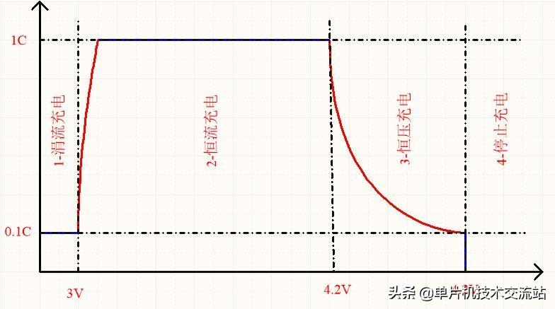 言归正传,锂电池的充电过程我们可以划分为四个阶段,1-涓流充电;2-恒流充电;3-恒压充电;4-停止充电。
