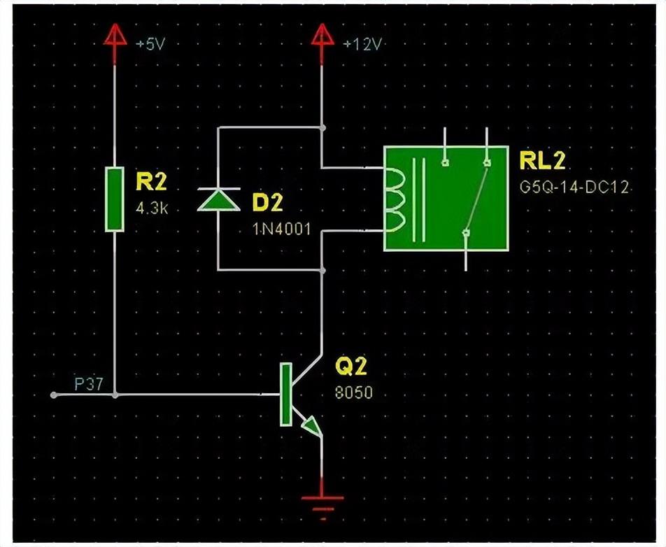 对于大于+5V的负载,如+12V,上面的电路就不行了。如果只是简单的把电源由+5V改为+12V,那么单片机输出的高、低电平,还是只有0~5V的变化幅度,这对8550射极的+12V来说,都是低电平。8550将不能截止。对于大于+5V的负载,只能使用NPN型的8050三极管来驱动,先以单片机输出高电平来驱动。电路如下: