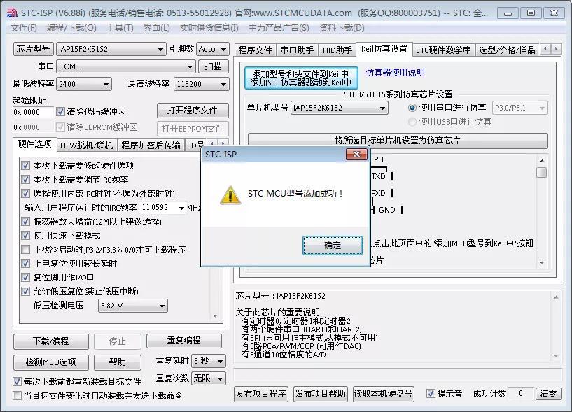 点击下边的“添加型号和头文件到keil中。。。”,在弹出的对话框中选择keil的安装目录,比如C:\keil,然后点击确定,如图所示,添加成功