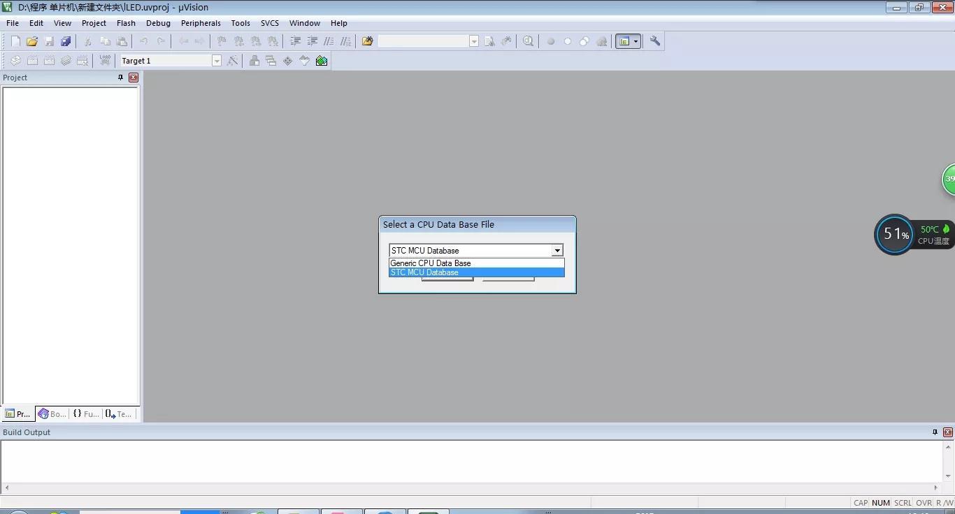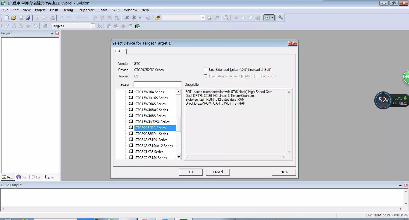 建立项目前,首先在硬盘上新建一个文件夹,文件名称可以取“例程”,或者你们自己喜欢的名字,用来存放项目文件,然后在keil新建项目,项目名称取“project”或者自己喜欢的名称。选择的就可以选择CPU时,选择STC MCU如图所示