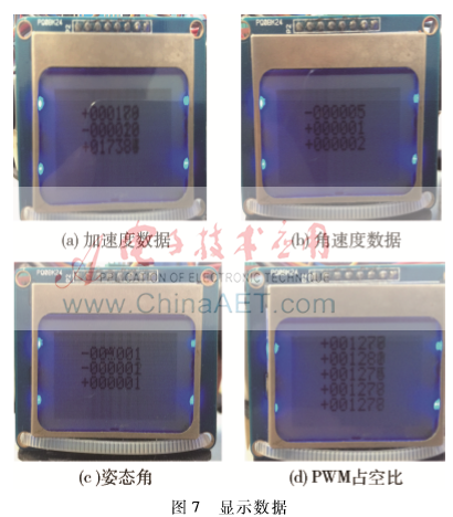 在姿态解算测试时,使用Nokia5110显示屏,通过更改程序,可分别显示传感器原始数据、递推滤波后数据、四元数算法融合后数据、PWM波占空比数据。这样可以让用户直观方便地了解到数据处理结果,便于发现问题并进行调试,如图7所示。