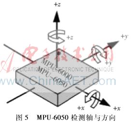 MPU-6050是全球首例整合性6轴运动处理传感器,由InvenSense公司推出。MPU6050整合了3轴加速度传感器和3轴角速度传感器,其检测轴与方向如图5所示。