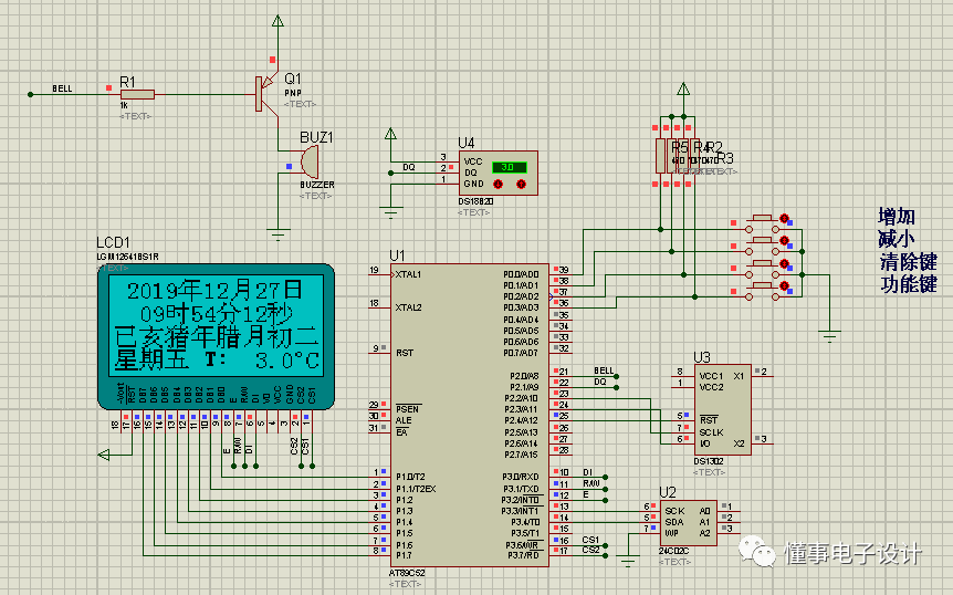 单片机使用的是AT89C52。时钟芯片是烂大街的DS1302,系统还设置有一个外部EEPROM存储器24C02,四个独立按键,一个温度传感器DS18B20,一个蜂鸣器。显示器部分采用的是LCD12864,显示的内容可以丰富一些。电路就是这个样子,当然因为仿真嘛电路可以简单一点,如果要做实物还需要晶振、复位电路、电源。那些这里都不作介绍了。简单的了解电路以后开始动态测试。先上一张动态图。