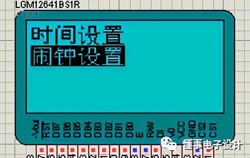 按下功能按键后,显示器显示上图界面,可以在选择“时间设置”和“闹钟设置”。那这样看来蜂鸣器的功能就是闹钟了。通过增加和减小按键可以在两个菜单选项直接进行选择,选中的内容会有黑色阴影处理。再次按下功能按键后就会进入到对应的功能模式。