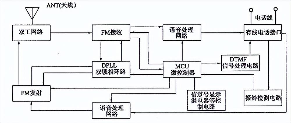 对照座机系统框图(图1),可知座机MCU涉及的主要功能是:(1)接收控制码。该控制码由手机MCU发出,经手机调制、发射,座机接收鉴频后经过滤波、整形处理输入座机MCU。(2)发送控制码。该控制码由座机MCU输出,经座机调制、发射给手机接受。(3)双锁相回路(DPLL) 控制。对锁相回路进行初始化、传送锁相数据(决定系统射频频点)、实现射频信道选择功能。(4)双音频产生器。实际上为MCU中一个DTMF(双音多频)子程序。作为民用产品,要求大批量、低成本、高质量,需要采取各种措施降低成本。事实上已有成熟的、本身带有硬件DTMF 发生器的单片机产品,但售价较高。而采用软件产生DTMF信号,则可以采用普通的通用MCU 实现同样功能。(5)振铃检测。检测是否有冷流从市话网内传来。(6)继电器控制。用于控制线路摘机和脉冲拨号。(7)其他信号发生及信号控制。诸如信道号显示控制、发射电路电源控制、发送回路和接收回路音频闭音控制、脉冲/双音多频拨号方式转换控制等。