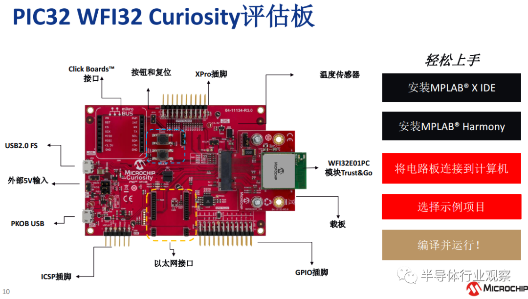其次看功能方面,如上图所示,Microchip的的软件库给客户提供了无线局域网具有的先进Wi-Fi功能和各种类型的网络协议栈。同时还将提供云连接的示例软件,满足不同场景下的设计需求。