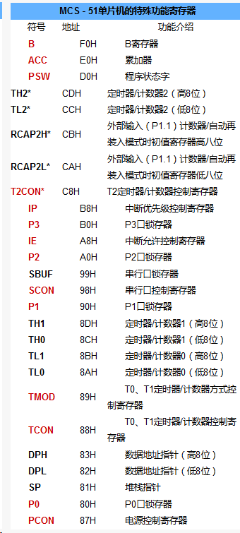 在51单片机内部有一个CPU用来运算、控制,有四个并行I/O口,分别是P0、P1、P2、P3,有ROM,用来存放程序,有RAM,用来存放中间结果,此外还有定时/计数器,串行I/O口,中断系统,以及一个内部的时钟电路。在单片机中有一些独立的存储单元是用来控制这些器件的,被称之为特殊功能寄存器(SFR)。这样的特殊功能寄存器51单片机共有21个并且都是可寻址的列表如下(其中带*号的为52系列所增加的特殊功能寄存器):