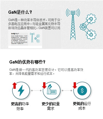 GaN 可处理更高频率和更高能效的电源,与硅组件相比,它可以在尺寸和能耗减半的条件下输送同等的功率。由此便可以提高功率密度,帮助客户在不增大设计空间的同时满足更高的功率要求。