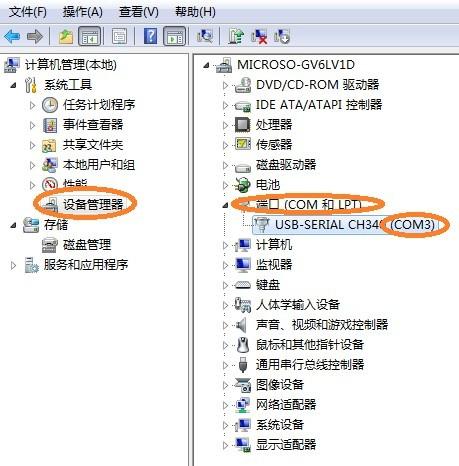 2.右键点击“我的电脑”并单击“管理”,在弹出的窗口中选择“设备管理器”,在点击右边的“端口”,可以看到USB转串口线的COM口(如图为COM3口),记住显示的是COM几口,下载程序时要用到,如下图: