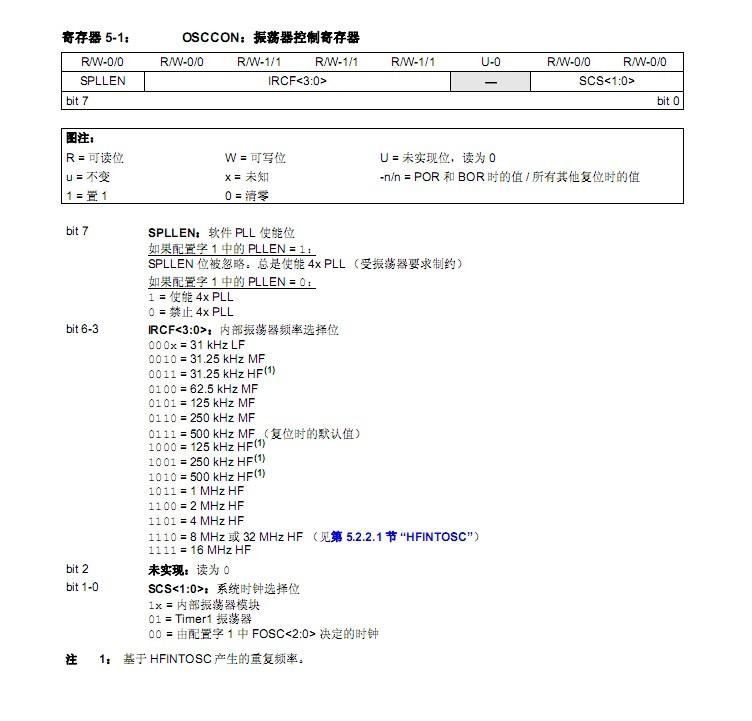 OSCCON 是有关内部时钟频率选择,如果只用外部时钟一般不理会。以下是数据手册中OSCCON寄存器的详细介绍。